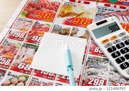 新聞折り込みチラシを見ながら特売品をメモするイメージ