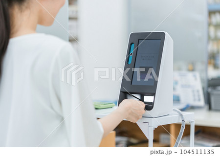 薬局・病院・ドラッグストアでマイナンバーカードをカードリーダーで読み込む女性