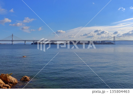 岩黒島の黒浜海岸から眺める瀬戸大橋内を走行する電車(瀬戸大橋線)