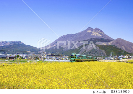 湯布院 由布岳と菜の花畑を走る「ゆふいんの森」