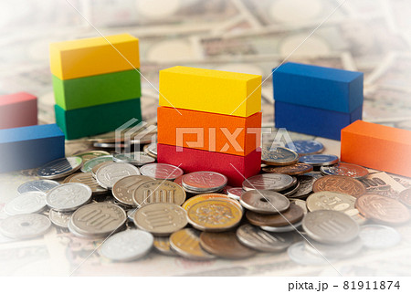 硬貨と一万円札とブロック 売上 税金 積立 家計 ローン 資産運用 紙幣 現金 借金 支援金 協力金