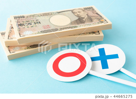 ○× 丸 バツ 札束 一万円札 審査 判定 プラカード お金 現金 紙幣
