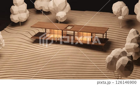 A modern wooden house model surrounded by stylized trees, set on a textured landscape, showcasing minimalist architecture and design. 3d rendering mock up house design.