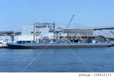 埠頭に停泊中の、海底ケーブル敷設船(ケーブル台船)