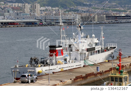 神戸港に停泊中の、水産庁の漁業取締用船「みうら」(斜め上方から俯瞰)