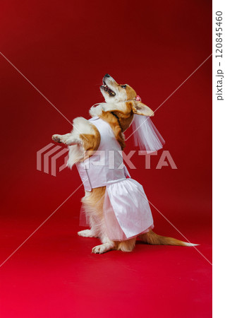 Adorable corgi bride dancing in a white wedding dress, spreading joy on a vibrant red backdrop
