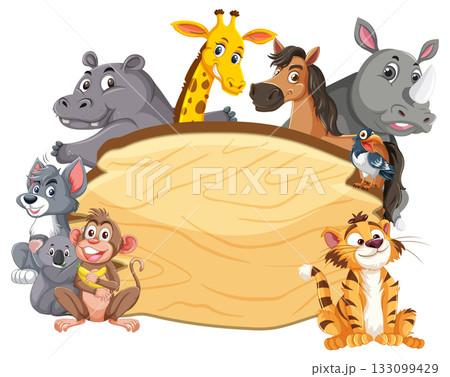 Cartoon Jungle Animals Surrounding Wooden Signboard Illustration