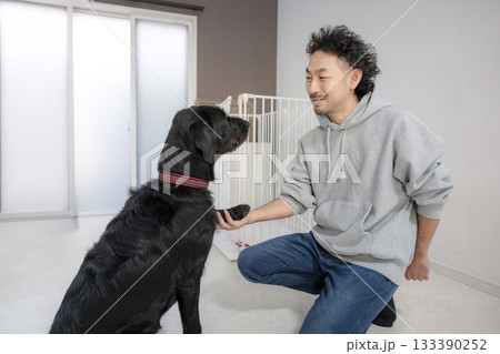 お部屋で犬のしつけ(訓練や躾)やトレーニングをする大型犬 飼い主に注目して見つめるかわいい