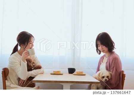 トイプードルとマルチーズと過ごす女性2人のカフェタイム ペットと暮らす休日のライフスタイル