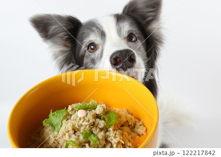健康的な手作りご飯を前に真剣な表情のボーダーコリー