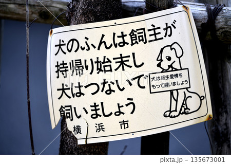 日本の横浜都市景観「犬のふんは飼主が持帰り始末し犬はつないで飼いましょう」「犬は終生愛情…=横浜市内