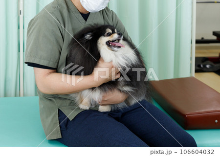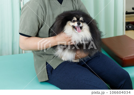 犬の整体、鍼灸院、動物病院イメージ。膝の上で抱っこされてお腹を触診してもらうポメラニアン
