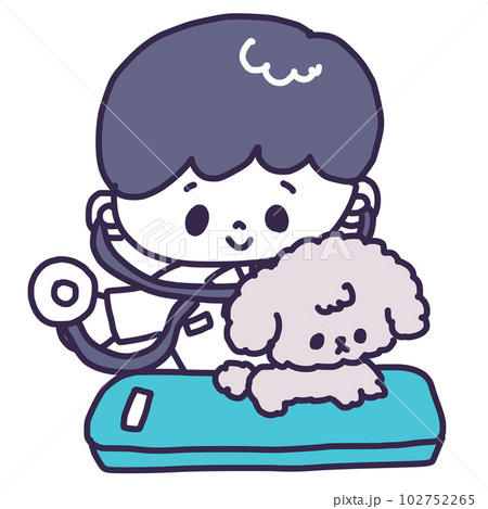 動物病院で男の獣医さんに注射されるかわいいトイプードルの子犬のイラスト