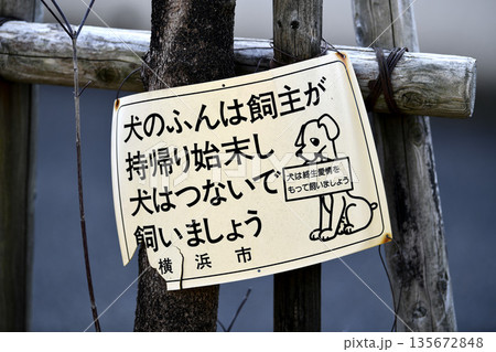 日本の横浜都市景観 ペットの散歩マナー…(「犬のフンとおしっこの始末は飼い主の責任です」)=横浜市内