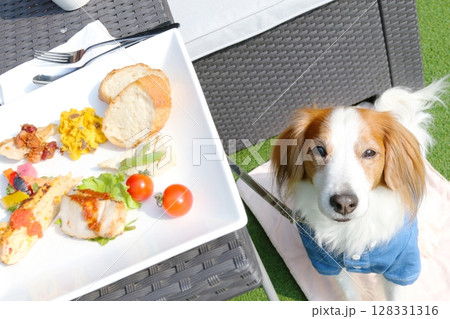 美味しそうなランチに興味津々な青い服のわんこ