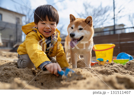 砂場で遊ぶ男の子と柴犬の夏の笑顔