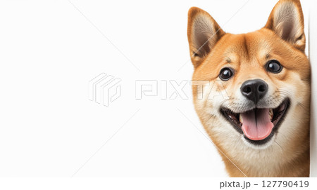 シンプルな背景から顔をのぞかせる柴犬の笑顔