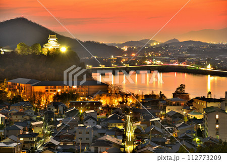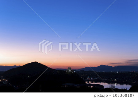 《愛知県》犬山市成田山から見た夕焼けに染まる犬山城下町と木曽川