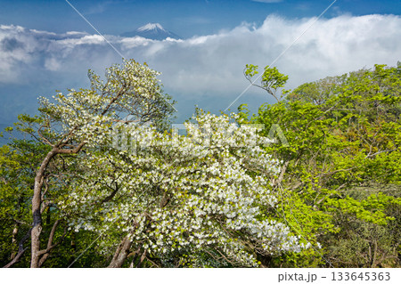 丹沢・檜洞丸稜線のシロヤシオツツジと雲上の富士山