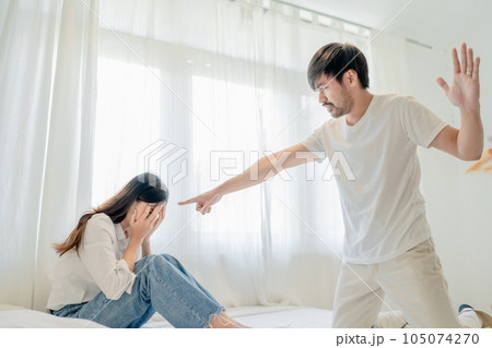 Domestic Violence, Asian Husband Threatening Wife, Scared Mother Embracing is her While Sitting Together On bed