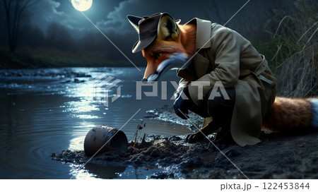Fox detective investigating mysterious pot by the river at night