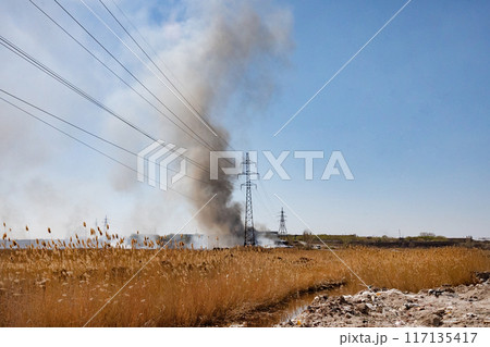 Ignition of dry grass and reeds near residential buildings.
