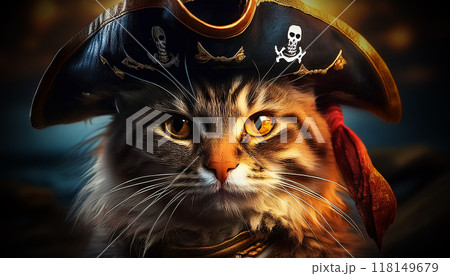 Cat Wearing a Pirate Hat and a Pirate Bandana Looking at Camera - Generative Ai