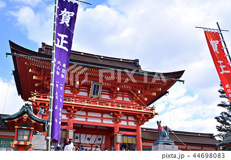 初詣風景 伏見稲荷大社 楼門と狛狐