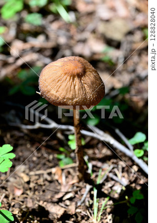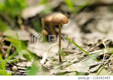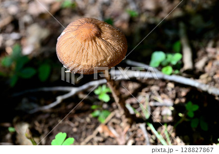 庭や空き地、緑地など身近な場所に生えるキノコ「ムジナタケ」(晴天下マクロ撮影)