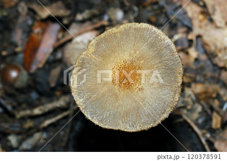 俯瞰で見る灰褐色のムジナタケ茸(自然光+ストロボ・マクロ接写)