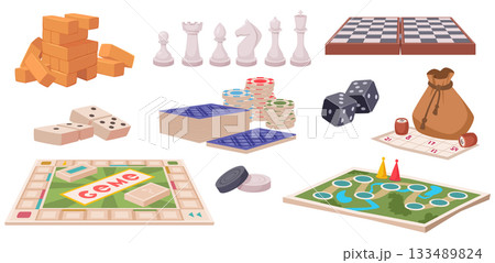 Family leisure board games. Chess monopoly puzzle cards. Isolated game for board and paper for adult and children freetime. Home fun recent vector set