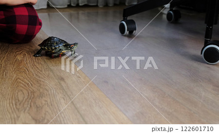 turtle sits on a tiny skateboard, being carefully pushed by a child's hand. The indoor setting reflects a fun and imaginative moment shared between a child and their reptilian pet.