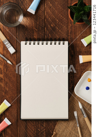 Empty sketchbook paper with art supplies on a wooden table. Space for your text or image.