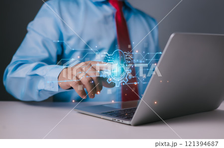 Intelligence artificial futuristic and technology development, Symbolic, Machine learning, AI network of brain on business analysis, Software for chat with AI, Businessman hand point to brain of AI.