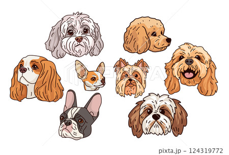 Dog breeds portraits collection cute canine faces colorful variety of small dog breeds illustrated on white background perfect for pet-themed designs