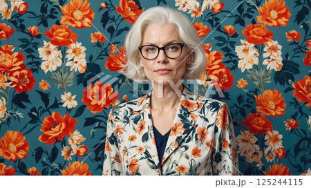 woman in a bold floral outfit, standing confidently against a matching floral background, creating a striking harmony of style and individuality