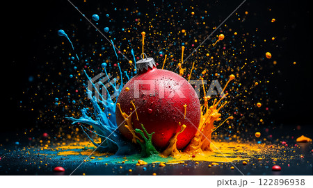 Colorful explosion features red ornament surrounded by vibrant splashes of blue and yellow paint