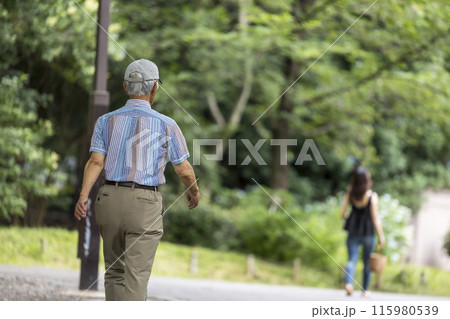 公園をウォーキングする高齢者男性