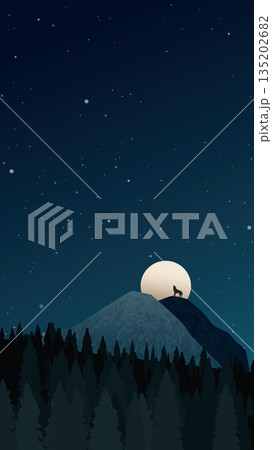Night of mountainscape with full moon, wolf howling and pines forest vector illustration. Hiking theme vertical background. Travel concept of discovering, exploring and observing nature.