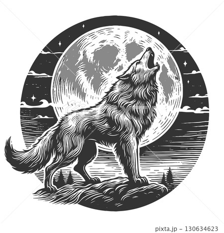 A lone wolf howling at the moon against the backdrop of a forest and sunset. For your sticker or logo design