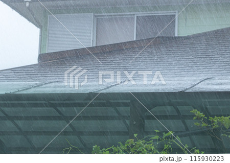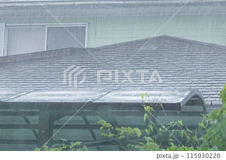 民家の屋根に大雨が打ち付けている 屋根とカーポート