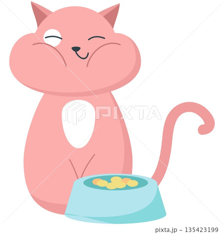 Cartoon illustration featuring an adorable, chubby ginger cat lounging on its side next to a bowl filled with pink food, radiating contentment and satisfaction after mealtime