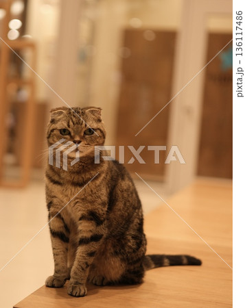テーブルの上で静かに佇むスコティッシュフォールドの猫