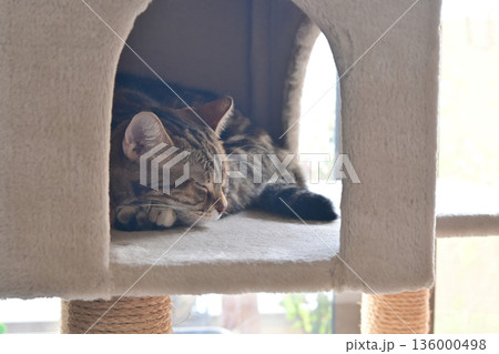 丸い木箱で丸くなって眠るキジトラ猫