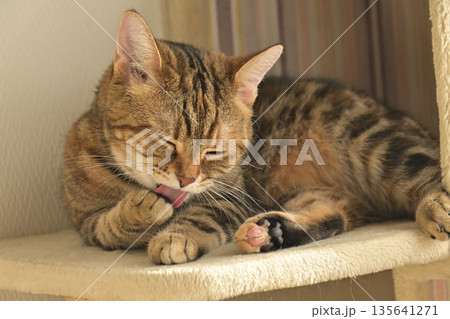 コンクリートの地面で丸まっているまだら模様の野良猫をクローズアップした風景