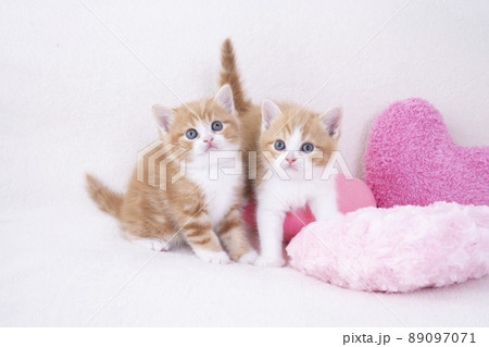 ピンクのハートのクッションと2匹のスコティシュフォールドの仔猫