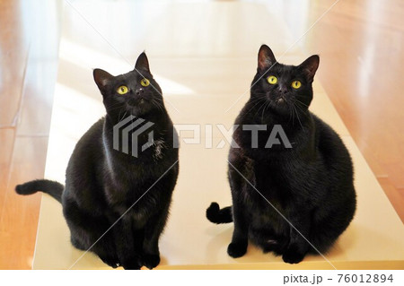 机の上に乗って一点を見つめる双子の黒猫の姉妹
