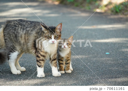 母猫に寄り添い甘える可愛い野良猫仔猫