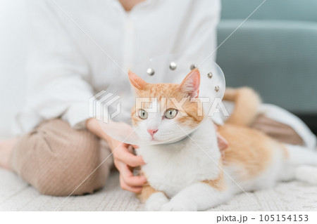 家でエリザベスカラーをつけた猫と飼い主の女性