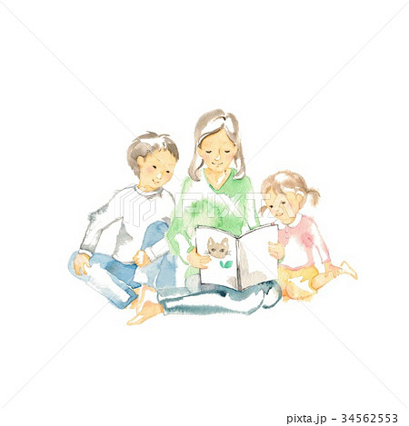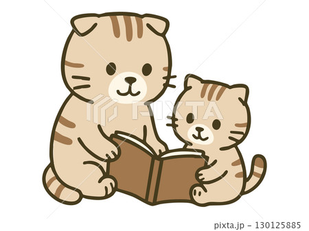 スコティッシュフォールドの猫親子が仲良く読書するかわいいイラスト
